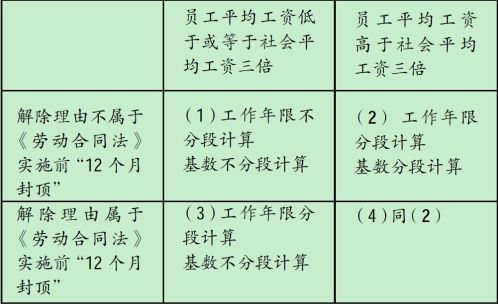 4、上表“基数不分段计算”指员工平均工资低于或等于社会平均工资三倍的情况下,《劳动合同法》实施前后均按实际员工平均工资计算。