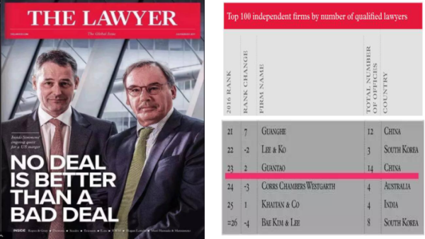 近日,英国著名法律杂志The Lawyer公布了2017年亚太地区律师事务所规模100强调查报告,观韬中茂律师事务所凭借其稳健的发展壮大、广泛的服务网络和优秀的市场表现,居于亚太地区第23位,与去年同期相比上升2名,延续了排名逐年上升的良好势头。报告中还提到观韬中茂律师事务所的创收增长率在35家提供数据的中资所中最令人印象深刻,以及观韬中茂上海办公室取得的显著成绩,成为律师行业的典范之一。