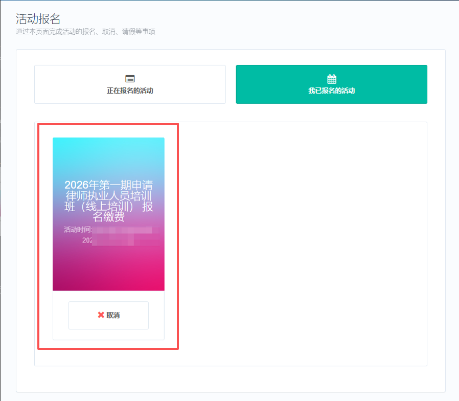 4、点击“已报名活动”,选择“2026年第一期申请律师执业人员培训班”,点击“缴费”;