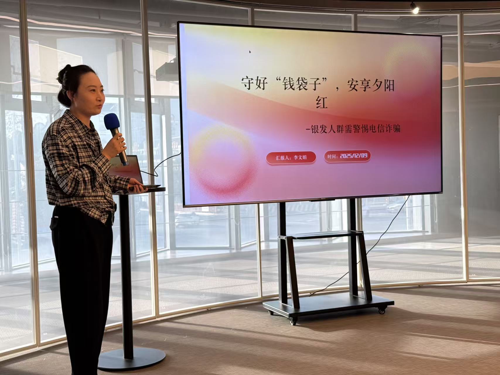 上海律协会展与旅游专业委员会委员李文娟律师从“守好‘钱袋子’,安享夕阳红-银发人群需警惕电信诈骗”为题,通过现实案例深入剖析了常见诈骗手法,并从刑法与专项司法解释角度剖析了电信诈骗相关法律规定,最后向大家传达了遇到电信诈骗时的自我保护指南,呼吁通过多部门、多主题联动宣传、通过科技助力与家庭协同,让晚年与诈骗绝缘。