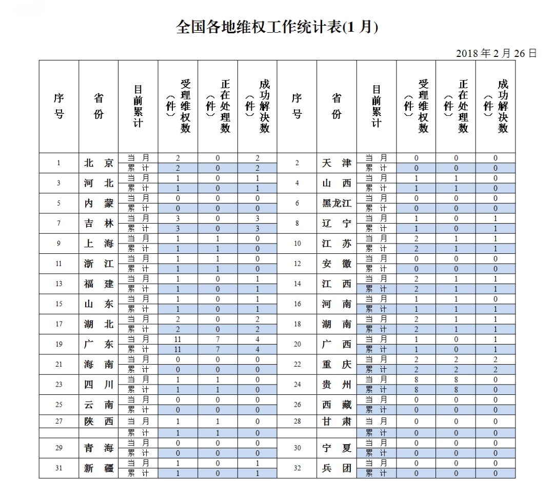 全国各省维权工作统计表(1月)