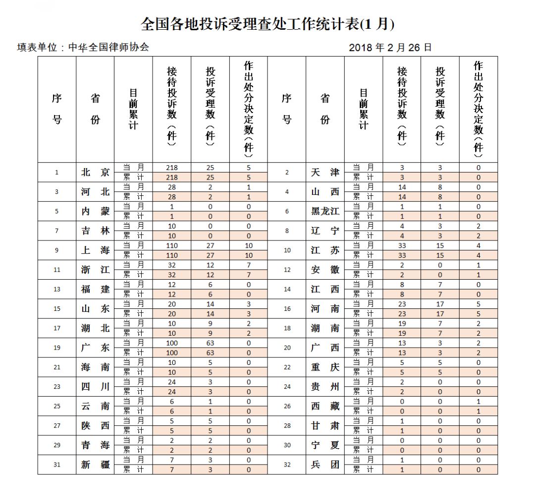 各省(区、市)和设区的市律师协会投诉中心1月份共收到投诉724起。其中来访投诉274起,通过专门工作电话投诉201起,来信投诉129件,网上受理平台收到投诉17起,上一级律协督办20起,司法行政机关转交83起。律师因代理不尽责和违规收案收费引发的投诉量排在前两位。各省(区、市)和设区的市律师协会1月份共受理投诉246起,处理情况为不予立案71起,调解处理65起,撤销案件5起,不予处分12起,给予行业处分45起(其中给予训诫10起,警告5起,通报批评16起,公开谴责2起,中止会员权利一个月以上一年以下10起,取消会员资格2起)。其他已立案未办结的投诉还在调查之中。