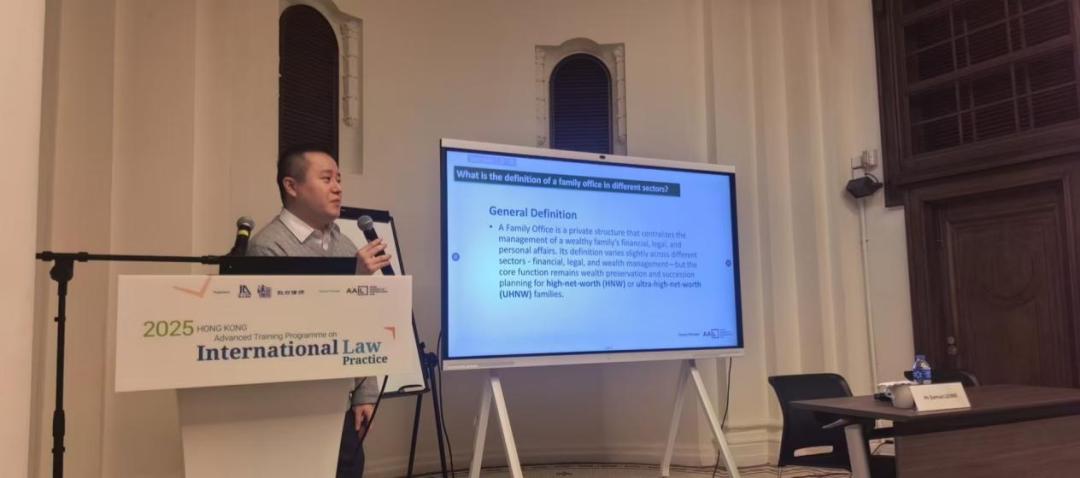 当天培训的最后,由来自Target International Trustee Limited的Mr. Samuel Leung为参训学员带来2022年至2025年间香港家族办公室政策演变的专题授课,讲解香港家族办公室的发展脉络、政策框架与实践要点,为律师拓展跨境财富管理法律服务提供了方向。