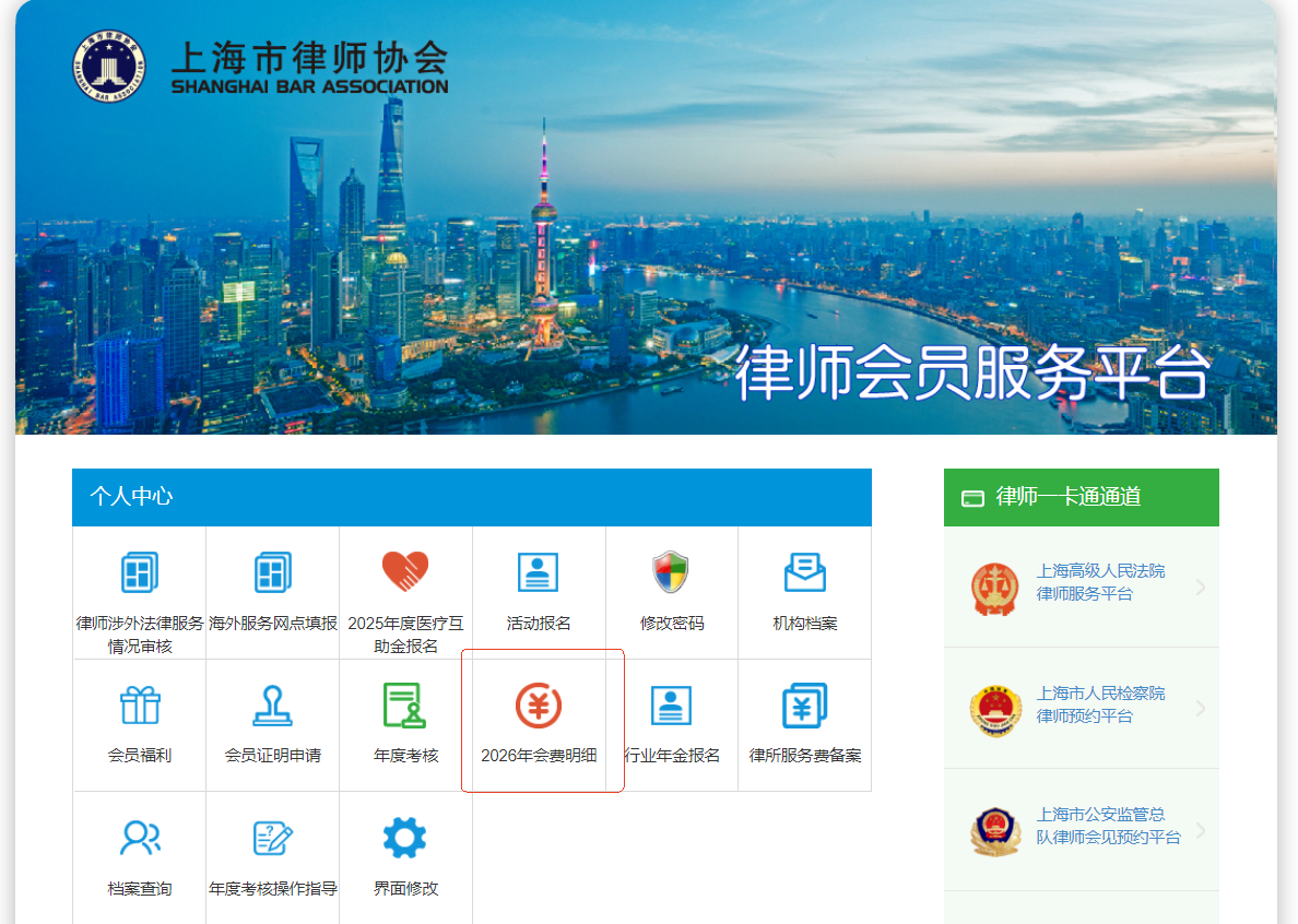 根据《上海市律师协会章程》《上海市律师协会会费交纳规则》、2012年第九届律师代表大会第二次会议通过的《上海市律师协会关于调整个人会费收取标准方案》,现对2026年度会费交纳有关事项通知如下:
