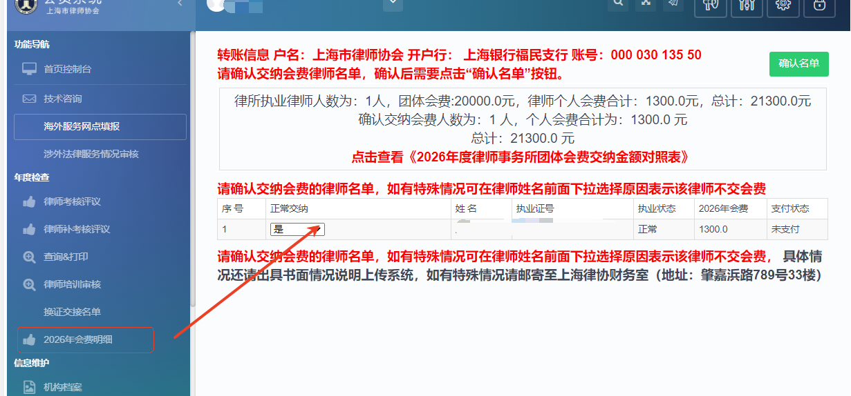 注意:请律师事务所在“2026年会费明细”页面确认需交纳的团体、个人会费情况。