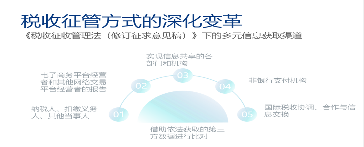 随着金税四期工程的推进和数字化监管能力的增强,《征求意见稿》顺应实践发展趋势,在法律层面明确和强化了税务机关的信息获取能力和治理协同机制,具体体现在两个方面:
