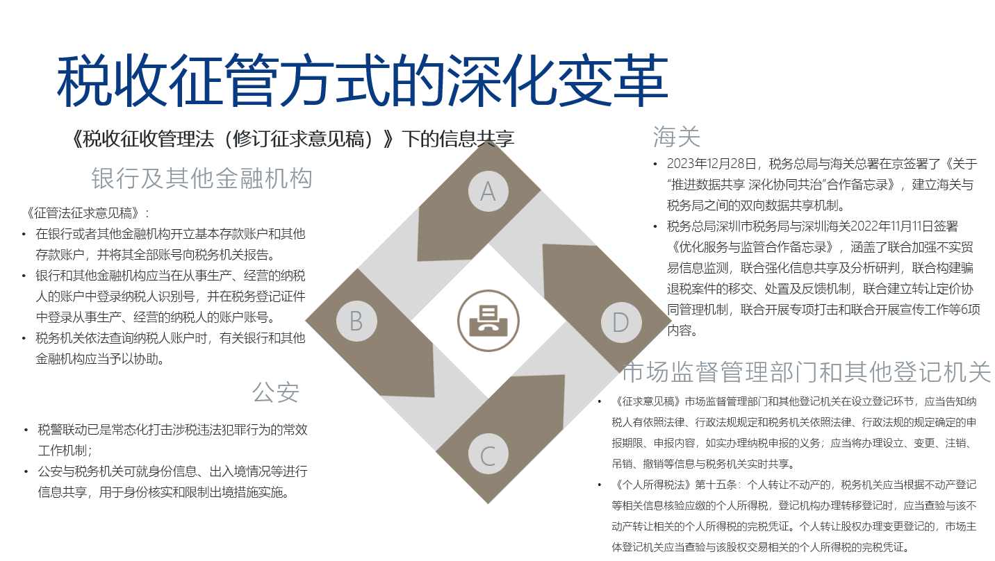 《征求意见稿》进一步夯实了跨部门税收协同治理的法律基础,强化了信息互联互通、资源共建共享的要求,体现了税收征管由“部门为主”向“全社会协同治理”的转变。
