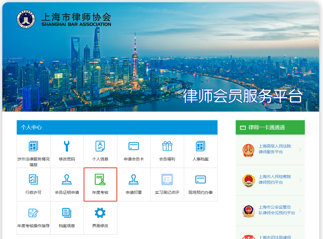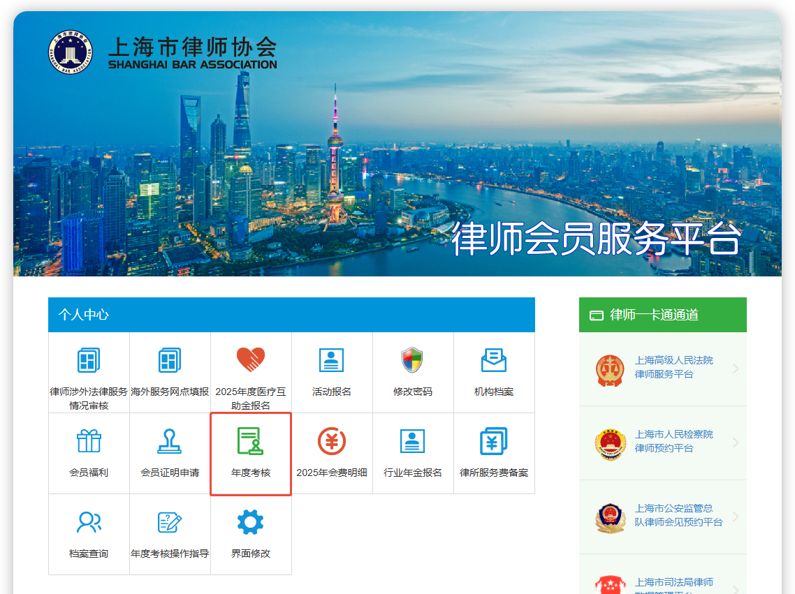 律师事务所通过团体会员账号登录东方律师网“会员中心”(http://www.lawyers.org.cn/new),进入“年度考核”栏目,对本所律师提交的《律师执业年度考核登记表(2025年度)》出具考核意见后,通过系统填写《律师事务所年度检查考核登记表(2025年度)》上报市律协。该栏目将于4月1日正式上线。