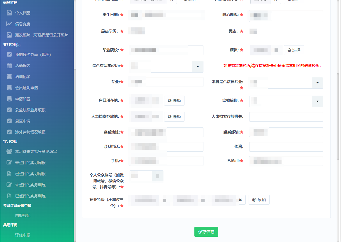 律师需仔细核对《律师执业年度考核登记表(2025年度)》上的各项信息,其中标注红色“★”的项目为必填项。