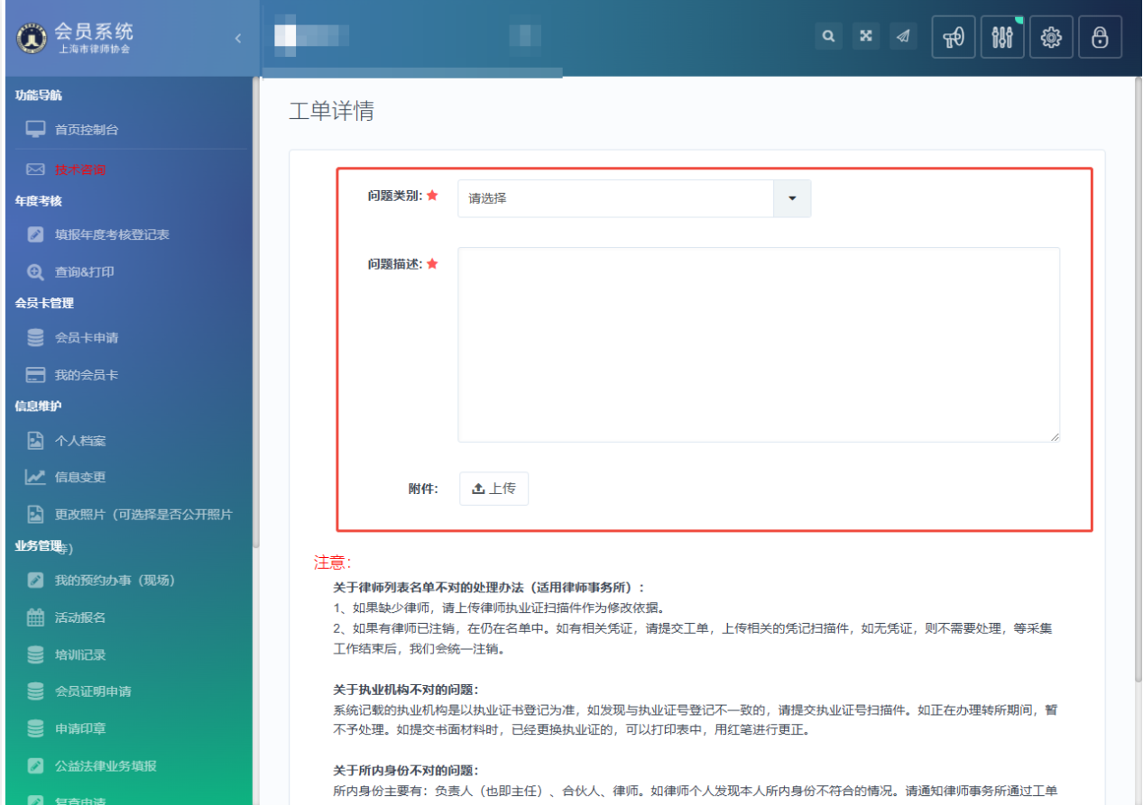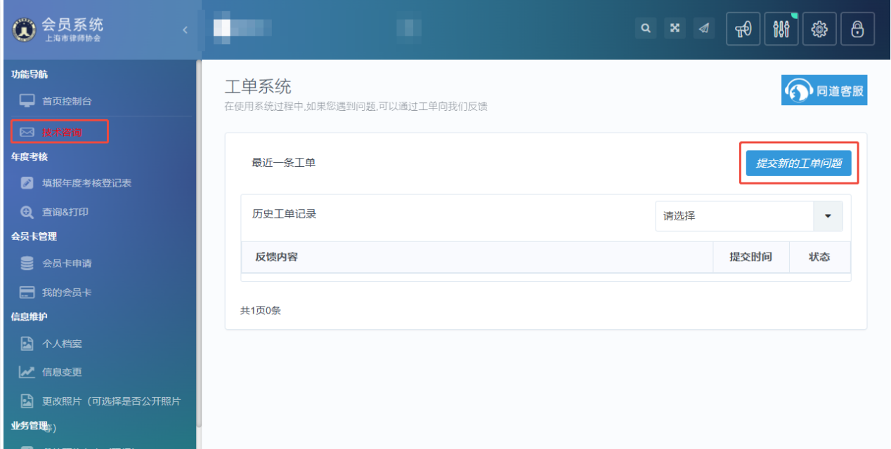 律师、律所也可在会员系统中提交技术咨询工单,技术将在1—2个工作日内完成回复处理。