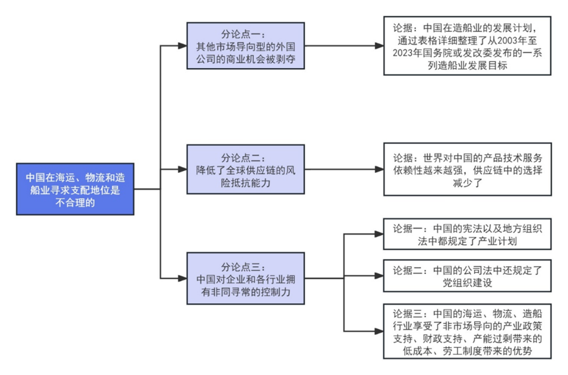 第三部分是在第二部分证明了中国在海事、物流和造船业寻求支配地位的基础上,论证这样的行为是不合理的,通过三个分论点展开论述,我们以图三思维导图呈现以便阅读。