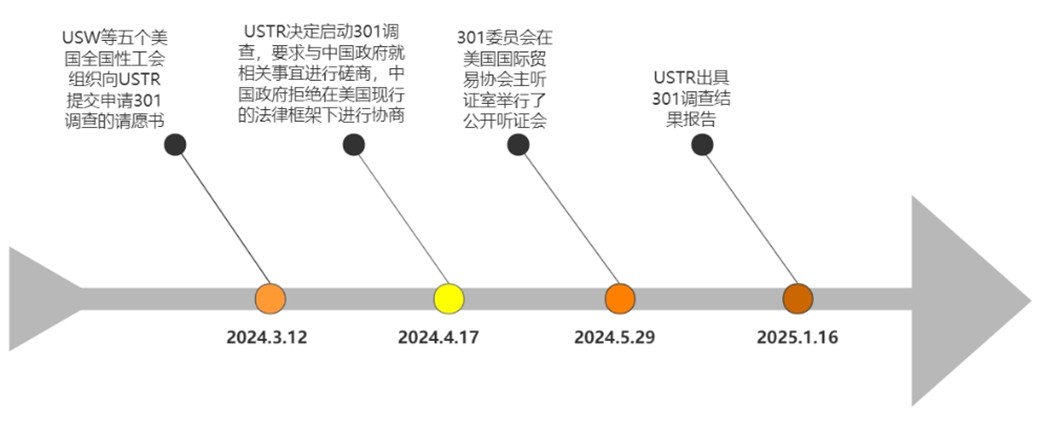 本次调查的大致过程,可以参见下图一中我们梳理的时间线,以快速了解背景信息。具体而言,本次调查最初系由美国钢铁工人联合会(简称USW)等五个全国性工会组织根据美国《1974年贸易法》第301条赋予的权利,于2024年3月12日向USTR提交请愿书(Petition),申请启动调查中国政府的有关行为、政策或做法是否不合理或具有歧视性,是否对美国商业造成负担或限制。USTR在审查请愿书及听取301条款委员会(the Section 301 Committee,以下简称“301委员会”)的意见后做出启动调查的决定,并于2024年4月17日要求与中国政府就相关事宜(根据美国301条款)进行磋商,中国政府拒绝在美国现行的法律框架下进行磋商。根据调查程序,301委员会于2024年5月29日在美国国际贸易协会主听证室举行了公开听证会。至2025年1月16日USTR出具调查报告,本次调查经过了约9个月时间,对比美国政府一贯的动辄耗时一两年的政务处理作风,不可谓效率不高。虽然调查报告中诸多内容十分空洞且牵强矛盾,但也总算是赶在拜登卸任前发布了调查结果。
