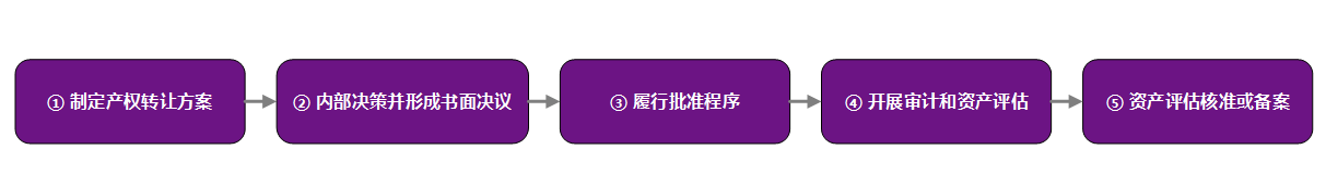 在开展企业产权转让行为时,转让方应首先完成转让决策与批准程序,相关流程大致如下(说明:为便于阅读,本文以下出现的图片中,紫色方块表示转让方的行为;蓝色方块表示产权交易机构的行为;绿色方块表示受让方的行为):