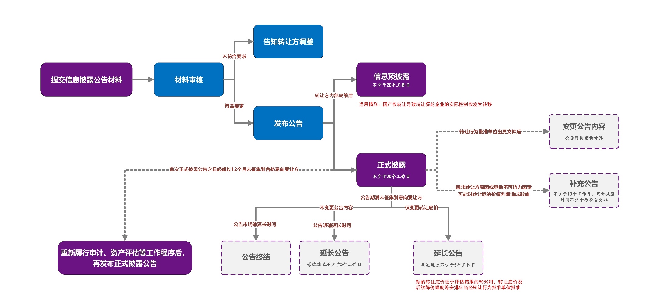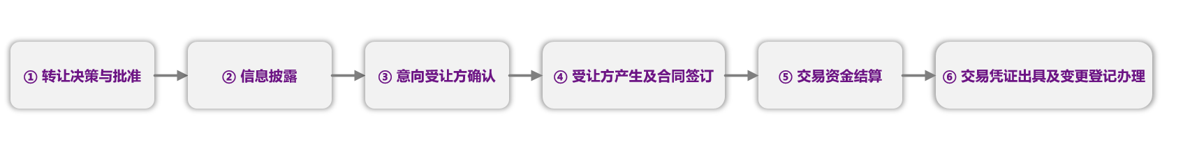 转让方履行完上述决策与批准程序后即可通过产权交易机构对外披露产权转让信息,相关流程大致如下: