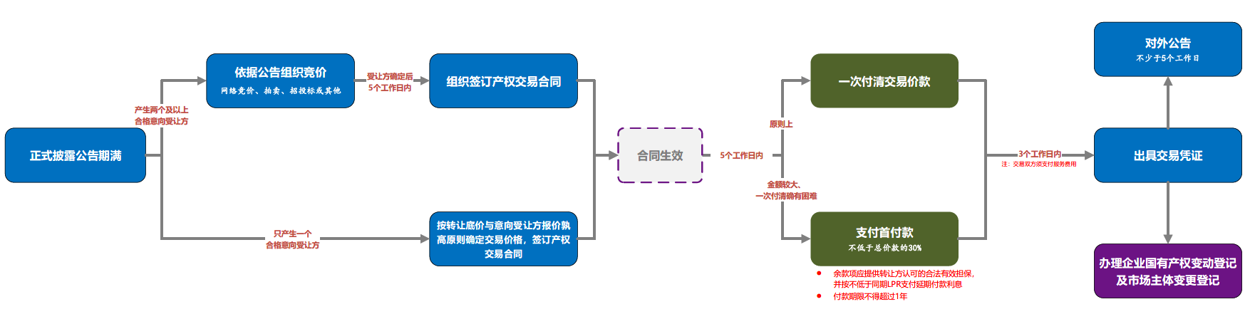 意向受让方确认后,受让方的产生及后续产权交易合同签订、交易资金结算、交易凭证出具及变更登记办理的相关流程大致如下: