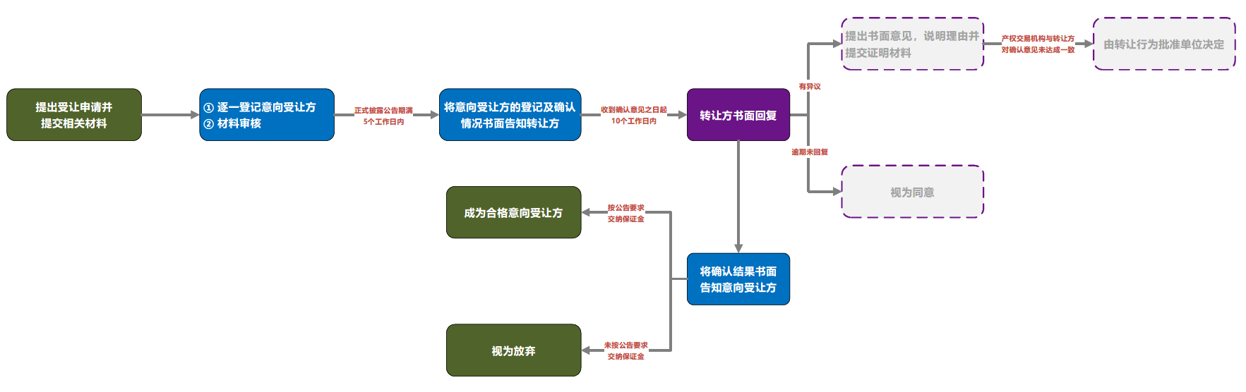 转让方通过产权交易机构对外披露产权转让信息后即进入意向受让方确认环节,相关流程大致如下: