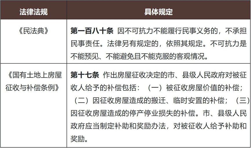 政府征收是《民法典》第一百八十条规定“不能预见、不能避免且不能克服的客观情况”(不可抗力),一旦发生,协议双方均免除不能履行民事义务的相关民事责任。换言之,如果屋顶所在建筑物被征收,屋顶业主无法继续履行能源管理协议,在该等情形下屋顶业主不负任何民事责任。