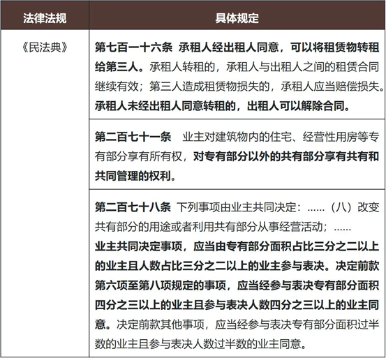(1) 转租情形:注意屋顶所在建筑物产权所有人与屋顶出租人是否一致,如果不一致,则应当在取得产权所有人出具同意转租的书面文件或另行签订转租协议(参见《民法典》第七百一十六条)后订立租赁关系,否则产权所有人有权要求解除租赁协议。同时,我们提示,在取得转租同意函或转租协议时,投资团队应当进一步注意所约定的转租期限是否覆盖了完整的项目运营期。