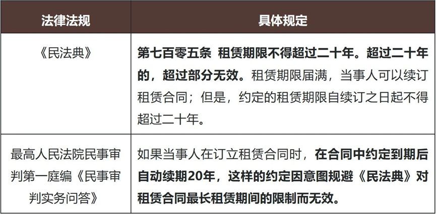 屋顶光伏项目的运营周期一般是25年,根据《民法典》第七百零五条规定,租赁期限的法定上限是20年,因此,很多项目合同中以“租赁期限为20年,到期自动续租5年”或类似表述对租赁期限进行约定,我们提示,这种“自动续租”的约定在司法实践中存在“因意图规避《民法典》对租赁合同最长租赁期间的限制”的嫌疑而被判定无效的风险,因此,我们建议,能源管理协议中可以约定“租赁期限为20年,双方于在期限届满前协商续订租赁合同”,以保证租赁期限条款的有效性,然而,该等表述调整也因为增加了续租的不确定性而经常受到质疑,基于此,我们进一步建议,可以考虑在签署租期20年租赁协议的同时与屋顶业主签署附生效条件的租期5年租赁协议,投资团队可以根据实际情况进一步细化除了“租期20年届满”以外的生效条件。