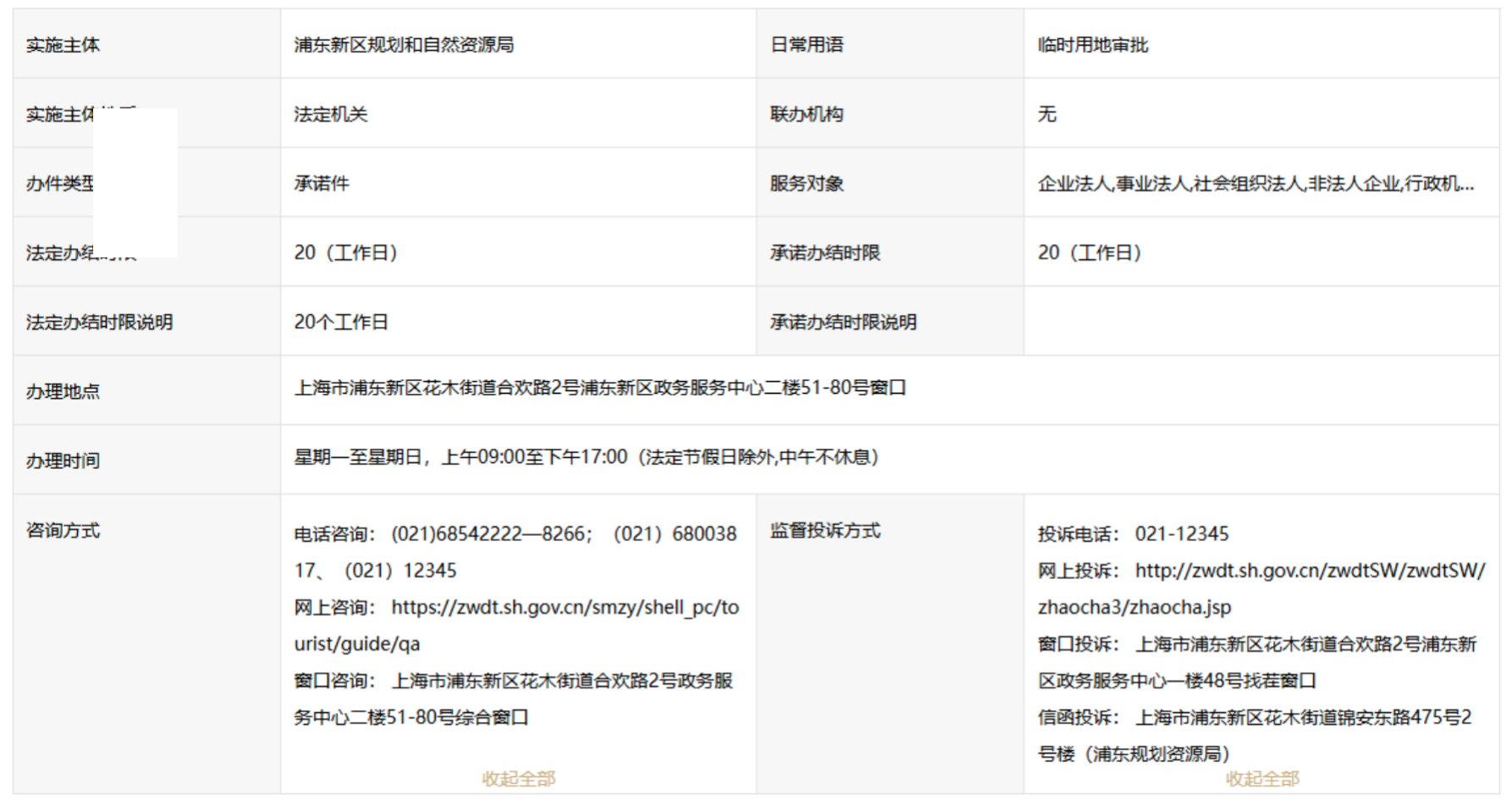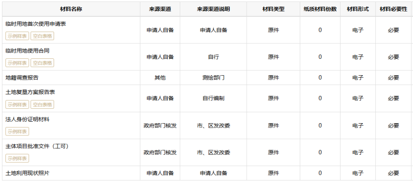 以上海市临时用地审批流程为例,临时用地申请官方网站:上海一网通办,网址:https://zwdt.sh.gov.cn/govPortals/bsfw/item/b14f8a69-e33d-4849-a8d7-8153ecb46800,以下图表是浦东新区规划和自然资源局审批相关事项截图: