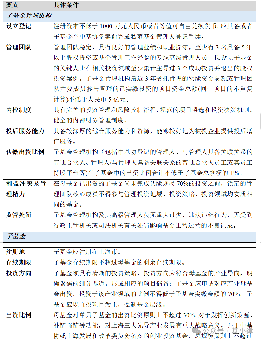 在近期,结合2024年6月国务院办公厅印发的《促进创业投资高质量发展的若干政策措施》(国办发[2024]31号),上海市政府为衔接国家有关部署、积极应对新的形势要求,在2024年7月30日在此基础上发布了《关于进一步推动上海创业投资高质量发展的若干意见》(以下简称“新《若干意见》”),支持金融资产投资公司扩大直接股权投资试点、并优化保险资金出资创投企业的相关监管要求。2024年9月,上海国有资本投资有限公司网站上已公布了《上海三大先导产业母基金第一批基金管理机构遴选公告》及《子基金公开遴选细则》,截至目前已有上百家机构进行申请。主要的申报条件包括: