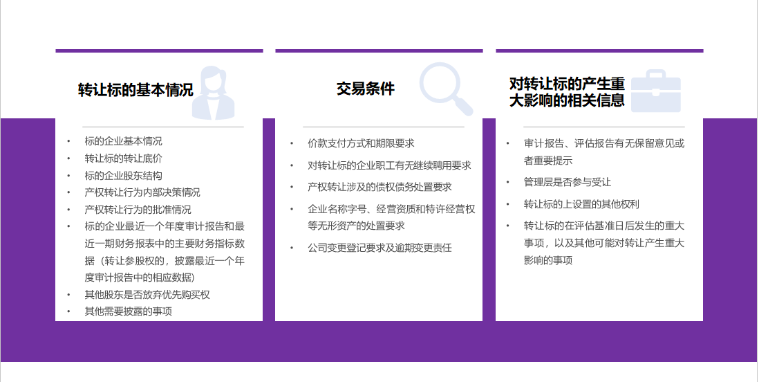 解读:相较信息预披露应提交的材料,正式信息披露应提交的材料增加了:标的企业产权登记表(证)、产权转让行为的批准文件、资产评估报告及核准或备案文件、职工安置方案及职工(代表)大会决议(如有)、标的企业债权债务处置文件(如有)。