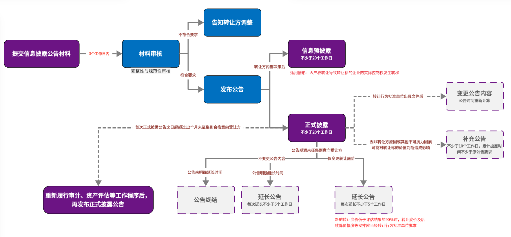 解读:上述流程与17号文的内容基本保持一致,《上海联交所企业国有产权转让操作规则》仅是在【材料审核】环节明确了上海联交所应在收到转让方提交的《产权转让信息预披露申请书》/《产权转让信息披露申请书》及相关附件等文档材料后3个工作日内进行完整性与规范性审核(17号文对时限未作明确要求)。