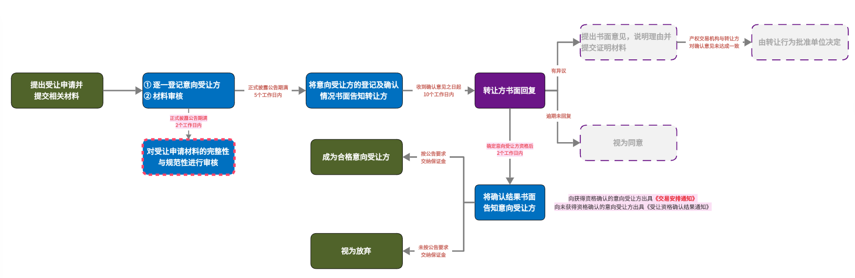 转让方通过上海联交所对外披露产权转让信息后即进入意向受让方确认环节,相关流程大致如下:
