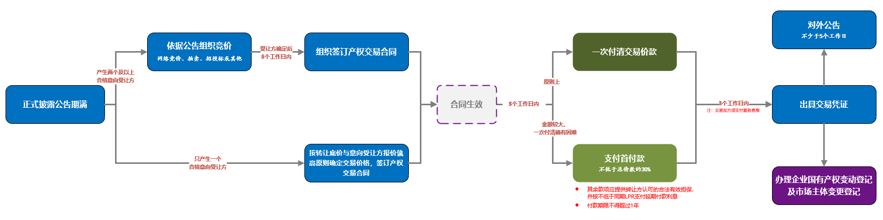 意向受让方确认后,受让方的产生及后续产权交易合同签订、交易资金结算、交易凭证出具及变更登记办理的相关流程大致如下: