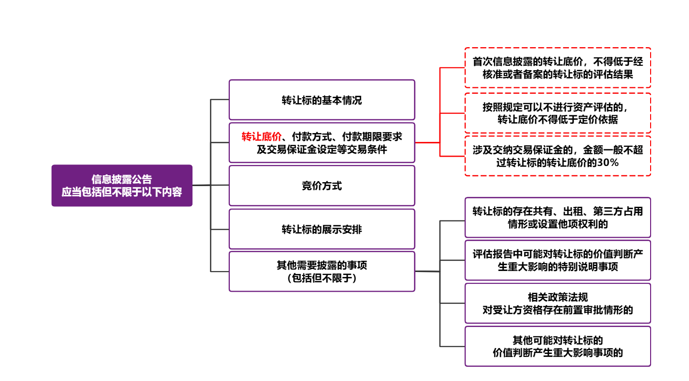 《操作规则》第四十三条参照17号文第三十九条产权转让的相关规定,对公告内容提出要求,包括:转让标的名称、转让标的评估结果、转让底价、交易价格等。