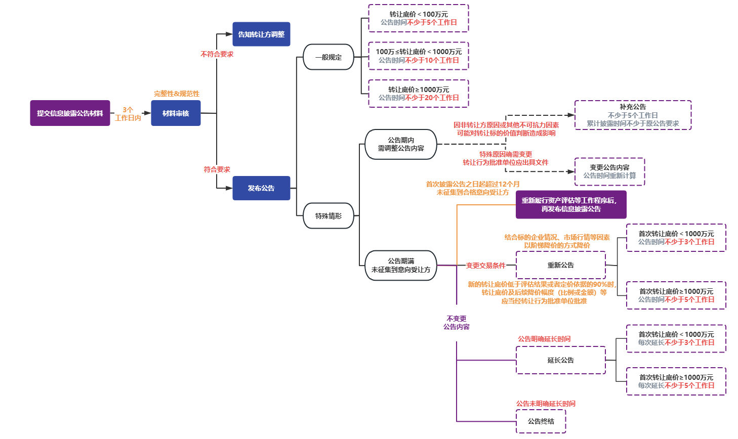 《操作规则》第十三条-第十八条依据17号文第十四条-第十六条及第八十一条、第八十二条修订,依据转让底价的高低设置不同信息披露公告的期限,并规定了变更公告内容、补充公告内容以及公告期满未征集到符合条件的意向受让方等情形下,公告期限的延长与重新计算。