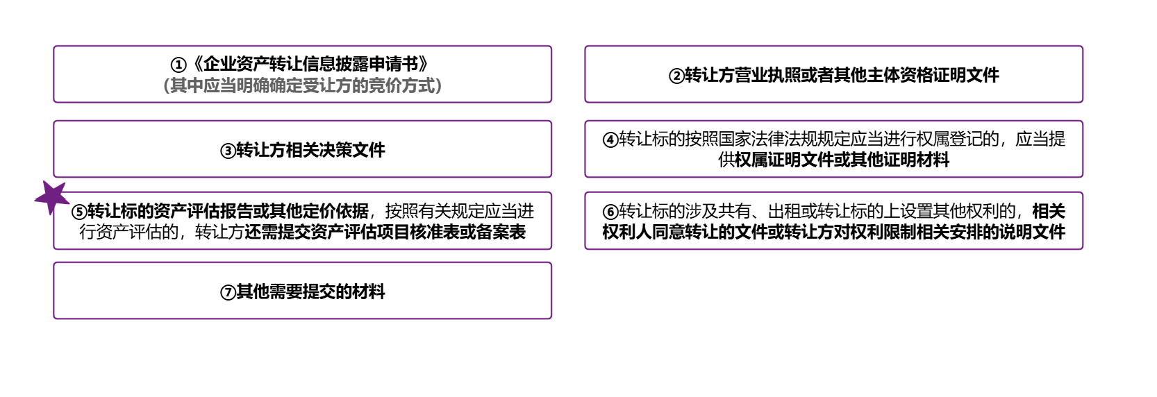 《操作规则》第六条在上海联交所现行规则《交易项目需提供材料的指引》之“企业资产转让材料清单指引”的基础上修订转让方在申请信息披露时应当向上海联交所提交的材料。