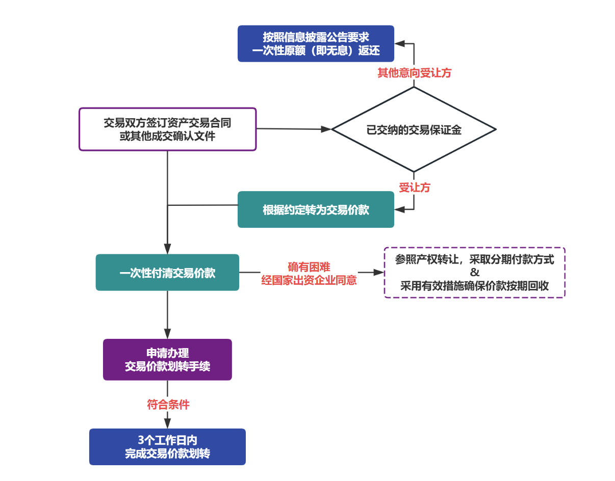 《操作规则》第三十一条、第三十二条、第三十四条参照17号文第三十四条、第三十六条、第八十四条,修订落实了国有企业资产转让结算交易资金的工作流程。