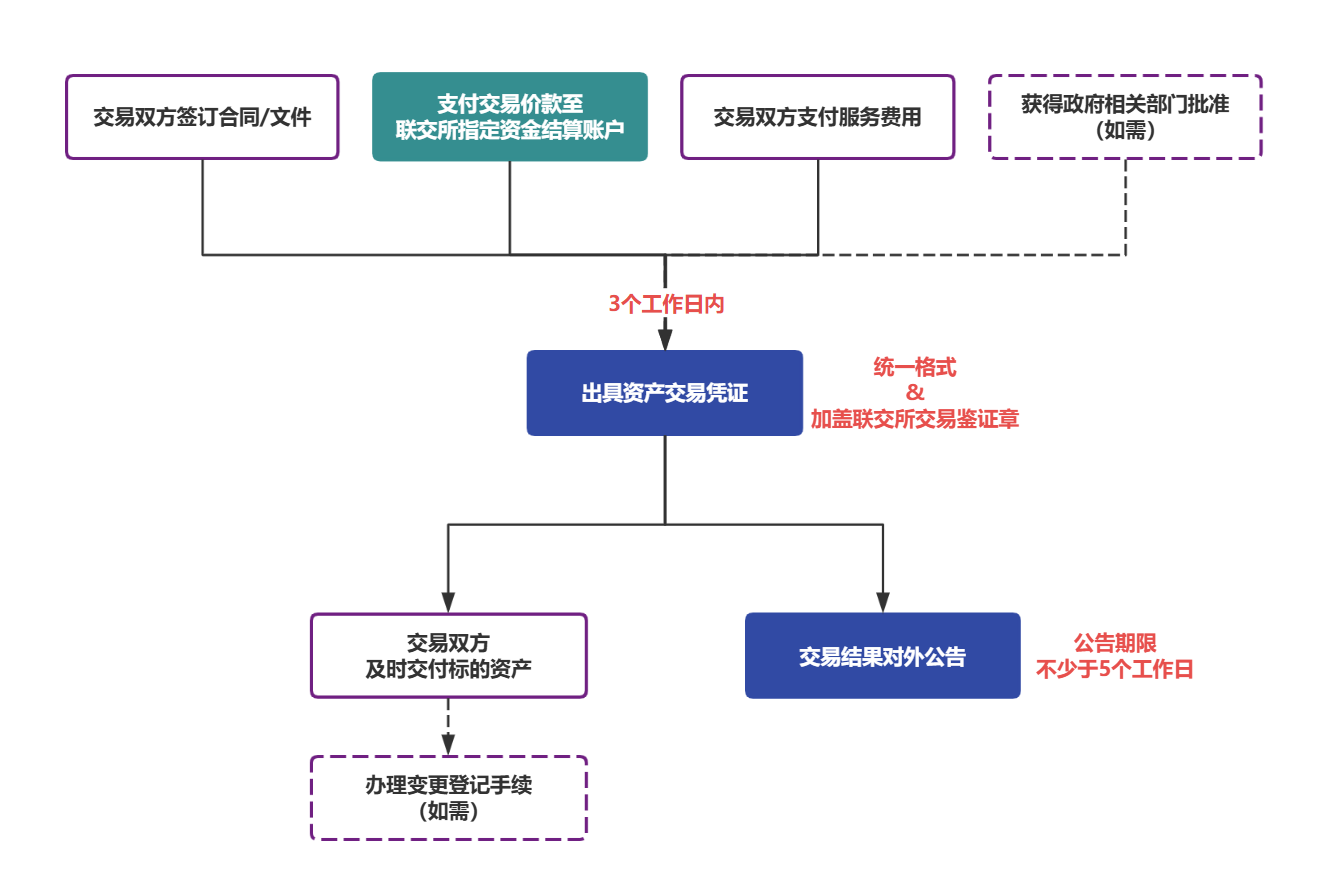 《操作规则》明确,交易资金包括交易保证金和交易价款。原则上,交易资金以人民币为计价单位,通过上海联交所指定的结算账户进行结算,不得由他方代为收付。交易双方因特殊情况不能通过上海联交所结算交易资金的,转让方应当向上海联交所提供转让行为批准单位的书面意见以及受让方付款凭证。涉及外币及跨境人民币结算的,交易双方应当按照外汇管理部门等相关规定办理结算手续。