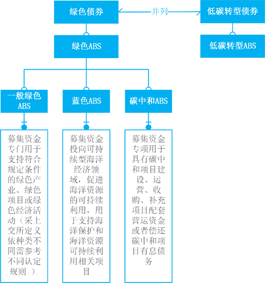 基于以上绿色债券与绿色资产支持证券的条线关系,就能够通过绿债的各个品种来认识绿色ABS的贴标子品种。以上交所目前已有的产品为例(即绿色公司债券领域),基于上述绿债四大核心要素之首——募集资金投向的不同,绿色债券子品种又有碳中和债券、蓝色债券。相应的,绿色ABS(在此例中为绿色企业ABS)项下也就有碳中和资产支持证券、蓝色资产支持证券。而依照这个逻辑,2022年交易商协会与沪深交易所推出的低碳转型债券下位产品就是低碳转型资产支持证券,但低碳转型债券及相应资产支持证券系绿债范畴之外的补充产品,主要服务于未被纳入绿色债券支持范围但正在积极进行低碳转型的传统工业型企业。
